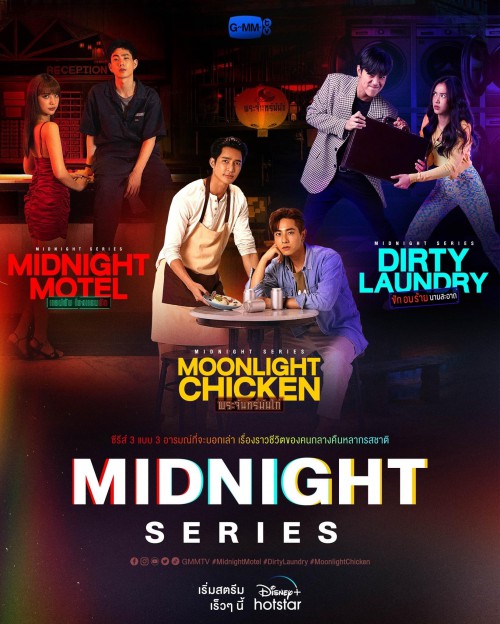 Midnight Series (มิดไนท์ ซีรี่ย์) ซีรีส์ 3 แบบ 3 อารมณ์ที่จะบอกเล่าเรื่องราวชีวิตของคนกลางคืนหลากรสชาติ เริ่มด้วยซีรีส์เรื่อง MIDNIGHT MOTEL แอปลับ โรงแรมรัก เป็นเรื่องราวของวัยรุ่นสร้างตัว...จน สร้างเรื่อง ต่อมาเป็นซีรีส์เรื่อง DIRTY LAUNDRY ซักอบร้ายนายสะอาด ปฏิบัติการซัก อบ ลุ้น วุ่น เงินล้าน! ซีรีส์สุดปั่น กับเงินล้านสุดป่วน และซีรีส์เรื่อง MOONLIGHT CHICKEN พระจันทร์มันไก่ มาเปิดสูตรรัก จานแห่งความสุข ซึ่งข้าวมันไก่จานนี้ จะทำคุณอิ่มไปถึงหัวใจ Midnight Series (มิดไนท์ ซีรี่ย์) ออกอากาศทุกวันเสาร์ Midnight Series (มิดไนท์ ซีรี่ย์) ออกอากาเวลา 20.30 - 21.30 น. Midnight Series (มิดไนท์ ซีรี่ย์) ออกอากาทางช่อง Gmm25